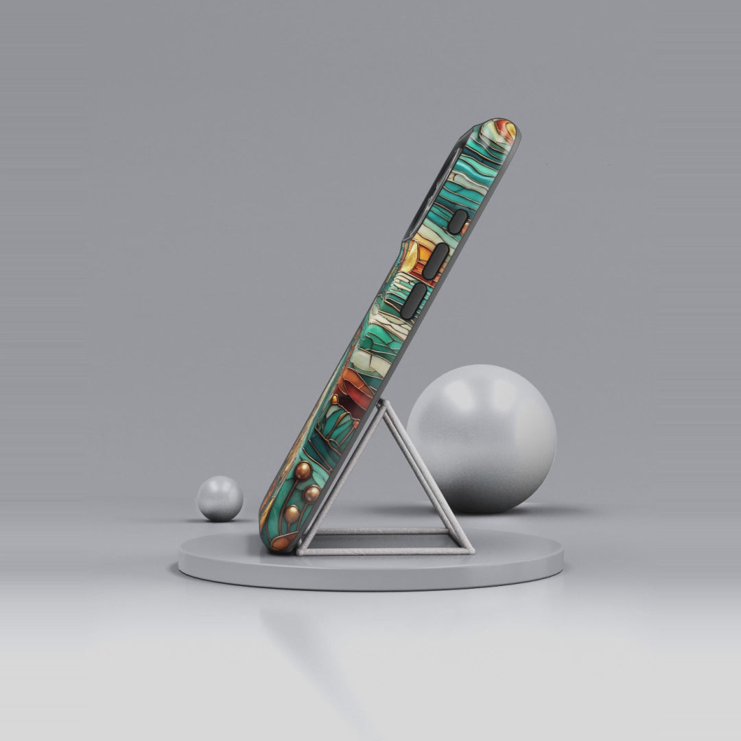 Custodia per telefono MagSafe resistente con paesaggio rustico al tramonto | Custodia protettiva artistica color verde acqua e rame