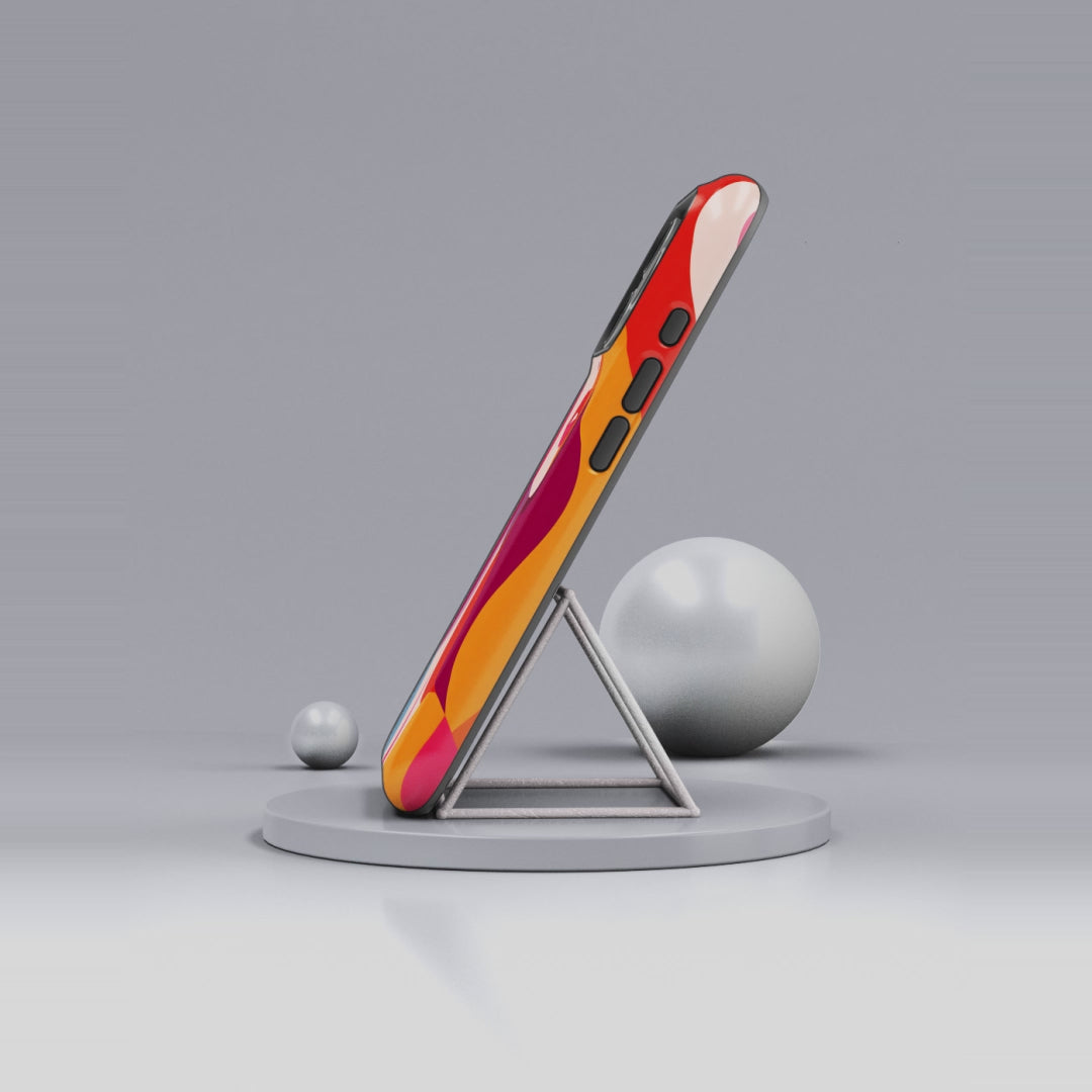 A vibrant protective phone case that brings bold, retro-inspired art to your everyday carry. Warm oranges, reds, and magentas flow in layered shapes to form a stylized portrait — a confident, artistic statement that brightens your pocket or bag. The dual-layer construction pairs a rigid polycarbonate shell with a soft TPU silicone liner for shock absorption and easy grip. Finished in your choice of glossy or matte, the print wraps fully around the case for uninterrupted color and coverage. Built for daily life: clear access to ports, wireless-charging compatible, and treated for outdoor durability so the design stays vivid through commuting, coffee runs, and late-night outings.